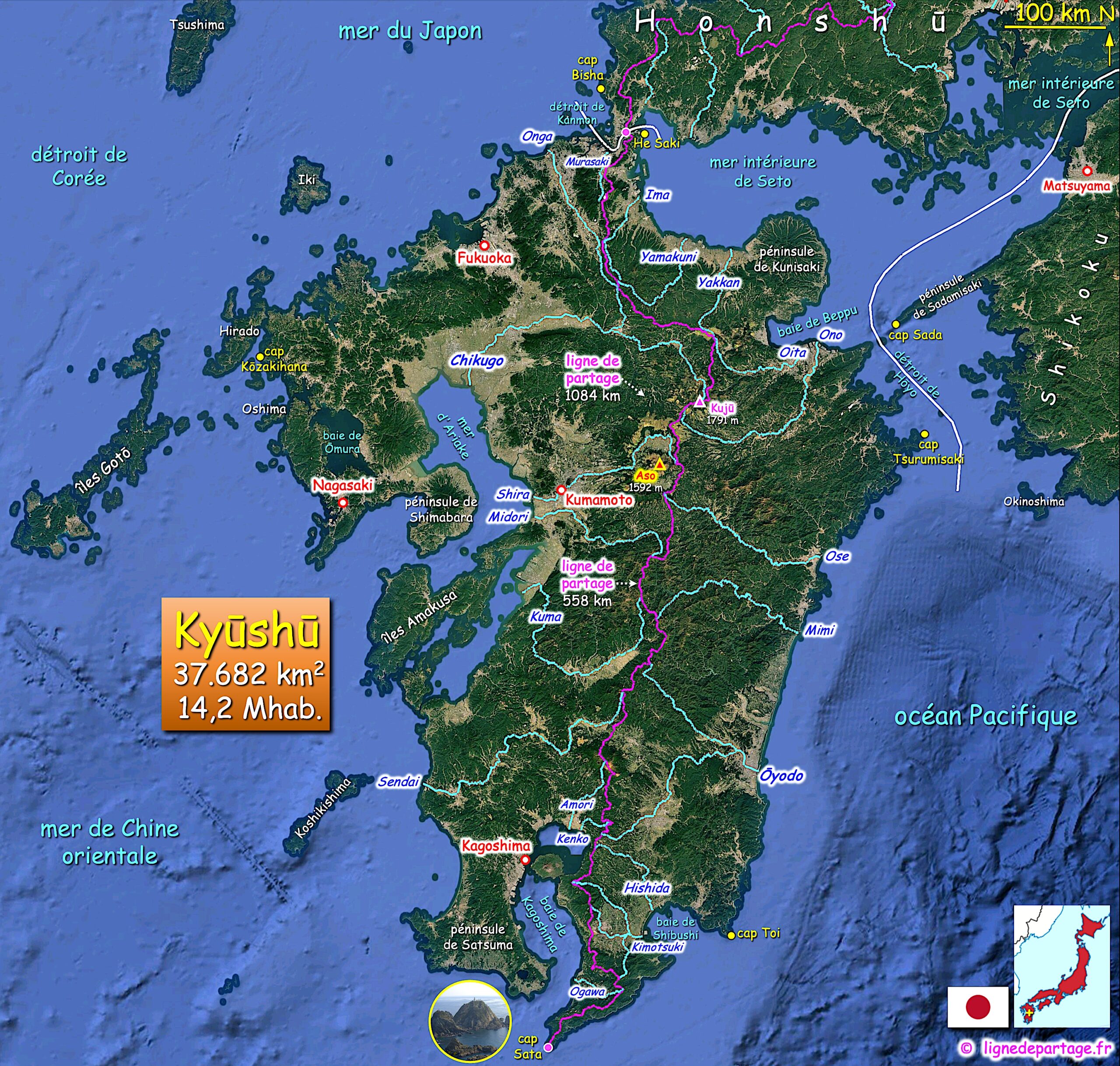Partage mer du Japon + mer de Chine orientale / mer de Seto +Pacifique : la ligne de partage des eaux entre l’ouest (mers du Japon et de Chine orientale) et l’est de Kyūshū (mer intérieure de Seto + plein océan Pacifique) a une longueur de 1.084 km entre le détroit de Kanmon (> carte) et le cap Sata (> carte > photo), extrême sud du Japon. Son altitude moyenne est de 710 m et le point culminant est aux monts Kujū 1791 m (> carte > photo) également point culminant de l’île.
