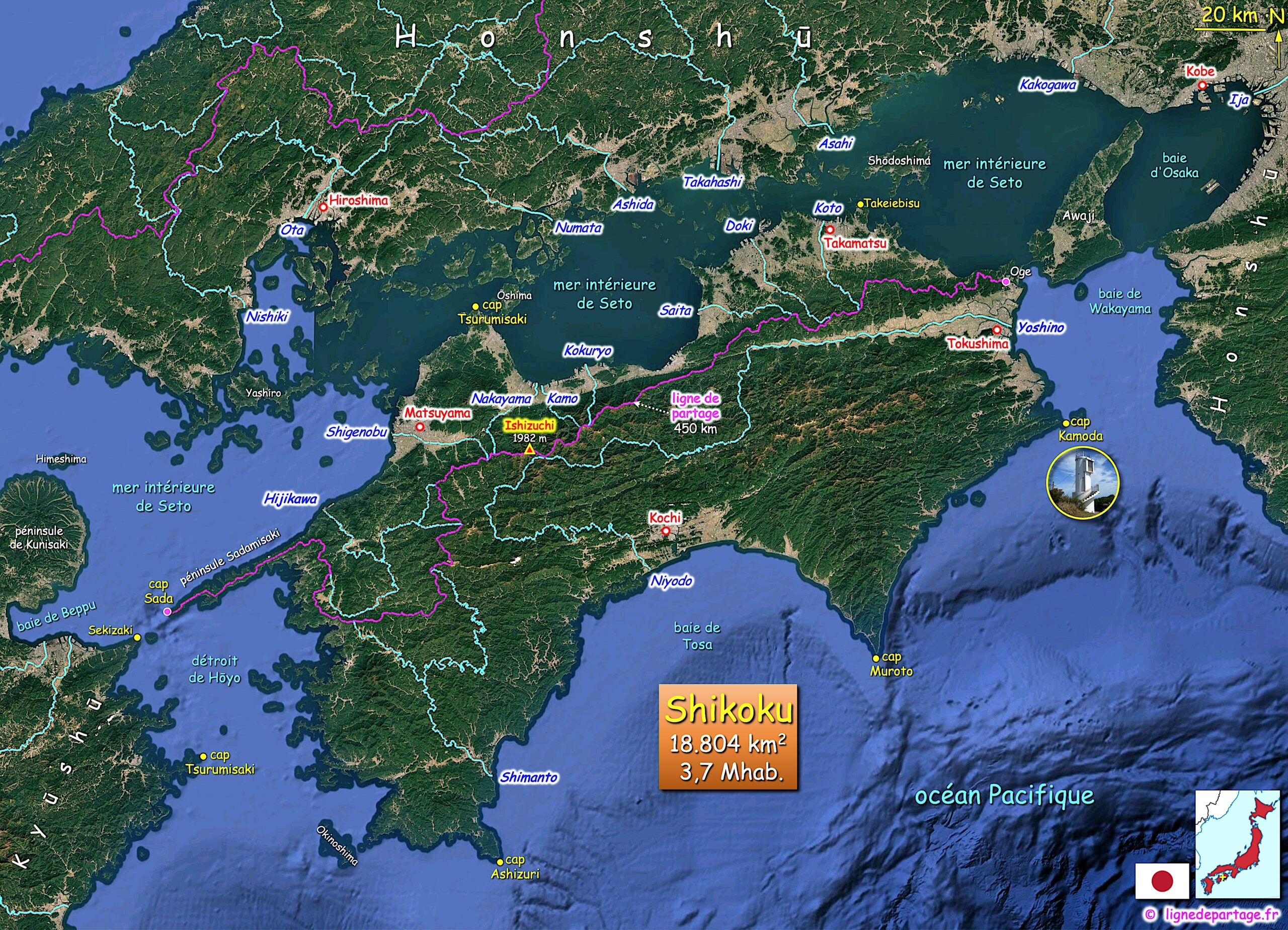 Partage mer intérieure de Seto / Pacifique : la ligne de partage des eaux entre la mer intérieure de Seto et le plein océan Pacifique a une longueur de 450 km entre le pont vers l’île de Oge et le cap Sada (> carte > photo). Son altitude moyenne est de 760 m et son point le plus élevé est le point culminant de l’île, le mont Ishizuchi 1982 m (> carte > photo).