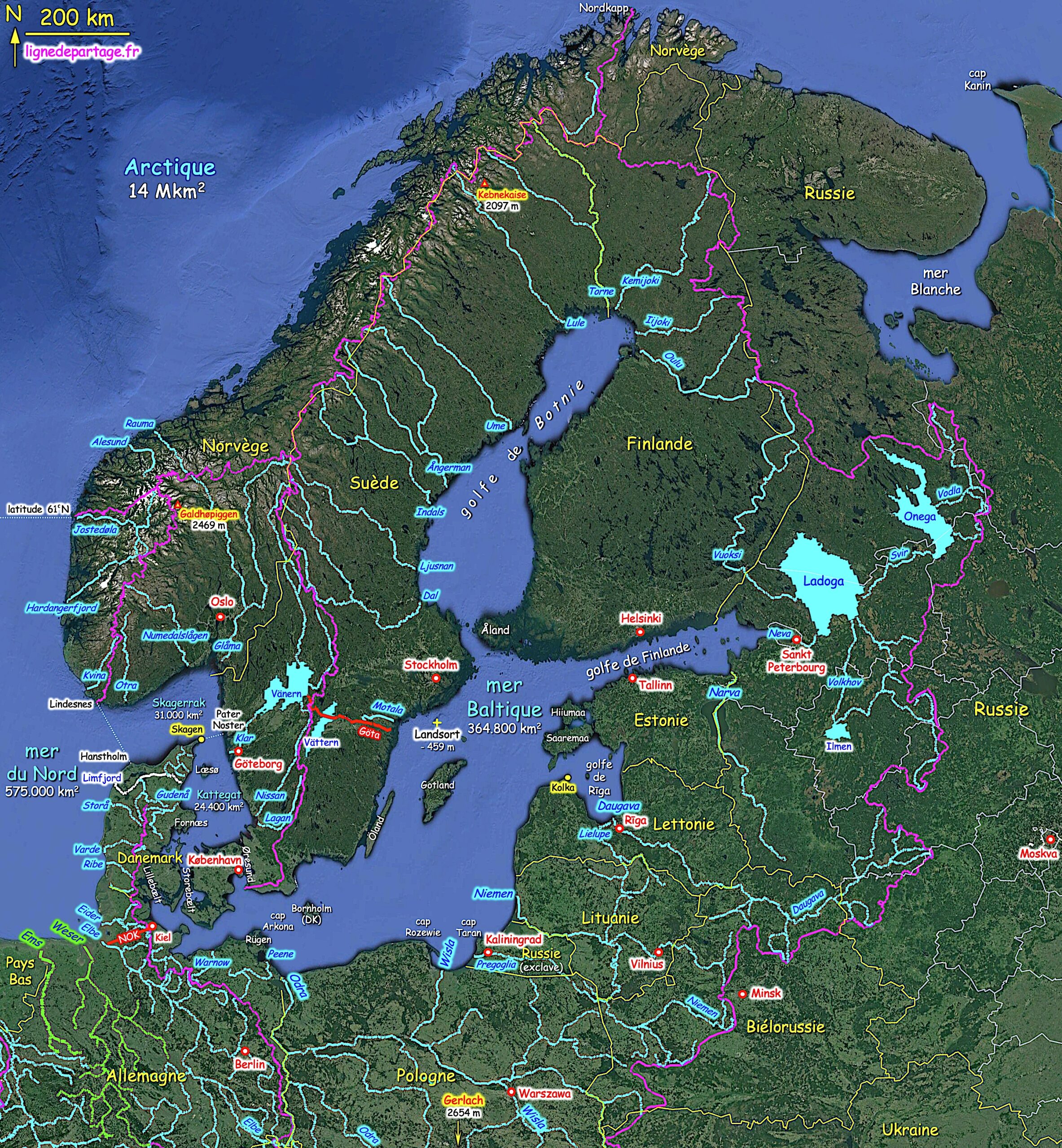 Bassin : le bassin versant de la mer Baltique a une superficie de 2 millions de km2 (terres et mer comprises). Son point culminant se trouve à l’extrême sud du bassin, en Slovaquie au Gerlachovský štít (pic Gerlach 2654 m). Le pic Gerlach (chaîne des Tatras) est également le point culminant du bassin de la Wisla (Vistule, plus grand fleuve baltique), de la Slovaquie et des Carpates. > carte > photo
