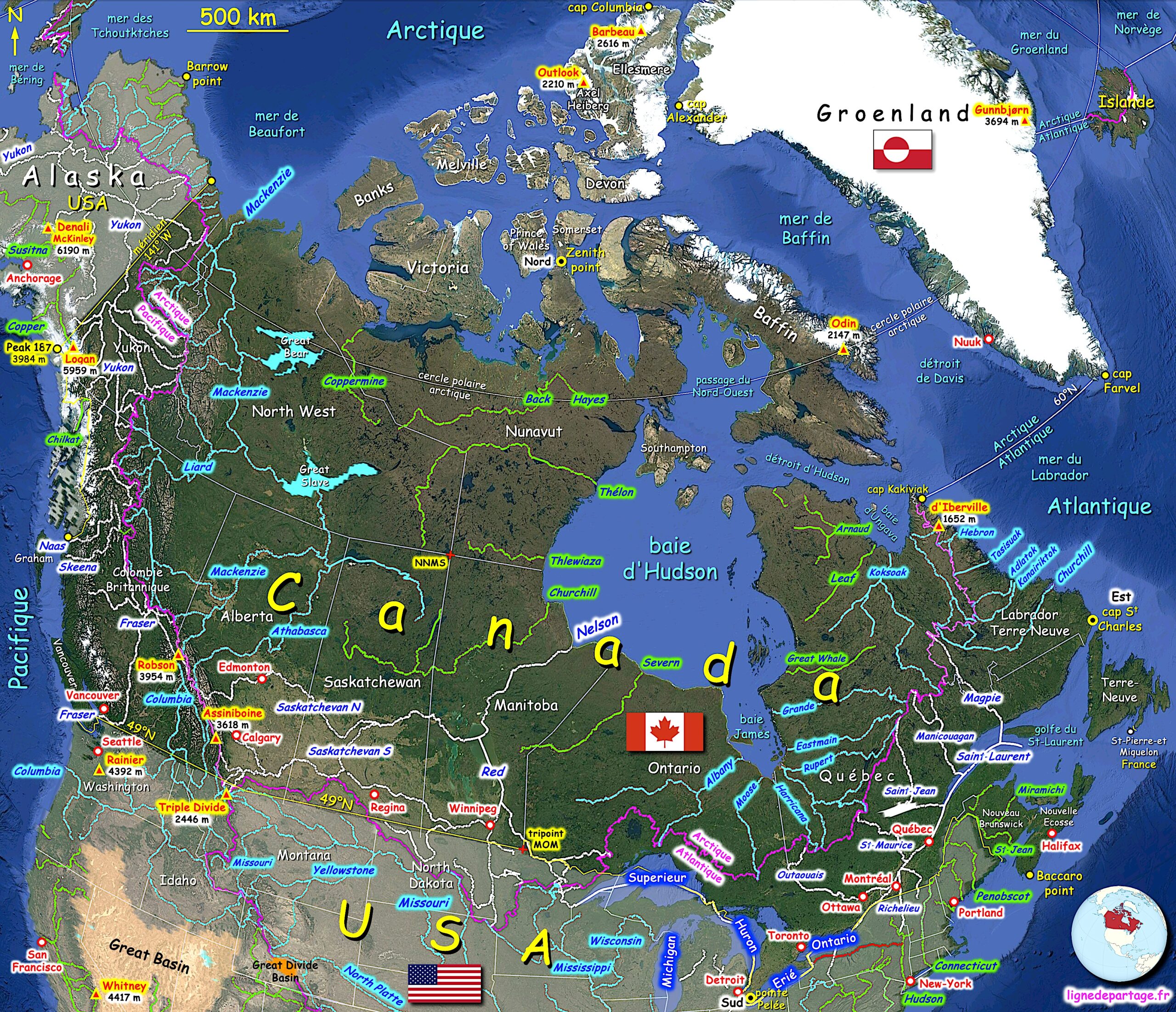 • Mount Logan 5959 m (> carte > photo) : point culminant du Canada, ce sommet se trouve dans le territoire du Yukon, à 33km à l’est du méridien 141°W frontière avec l’Alaska (USA). Il s’agit aussi du 2ème plus haut sommet d’Amérique du nord après le Denali / McKinley 6190 m (> carte > photo) d’Alaska.