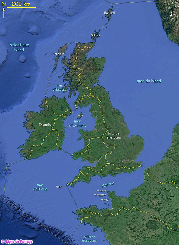 Partage des eaux : les lignes de partage des eaux entre les mers forment 9 branches pour la Grande-Bretagne.