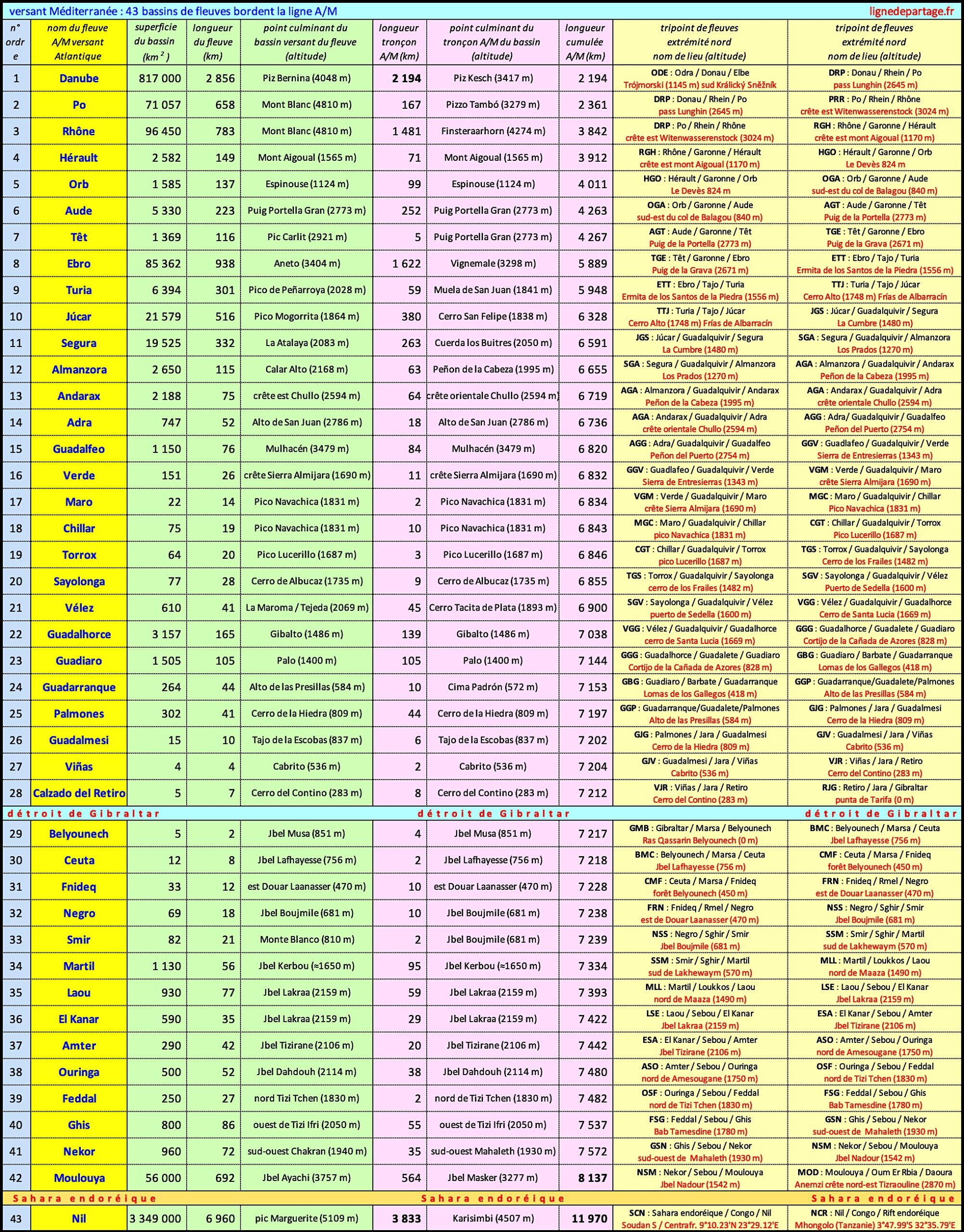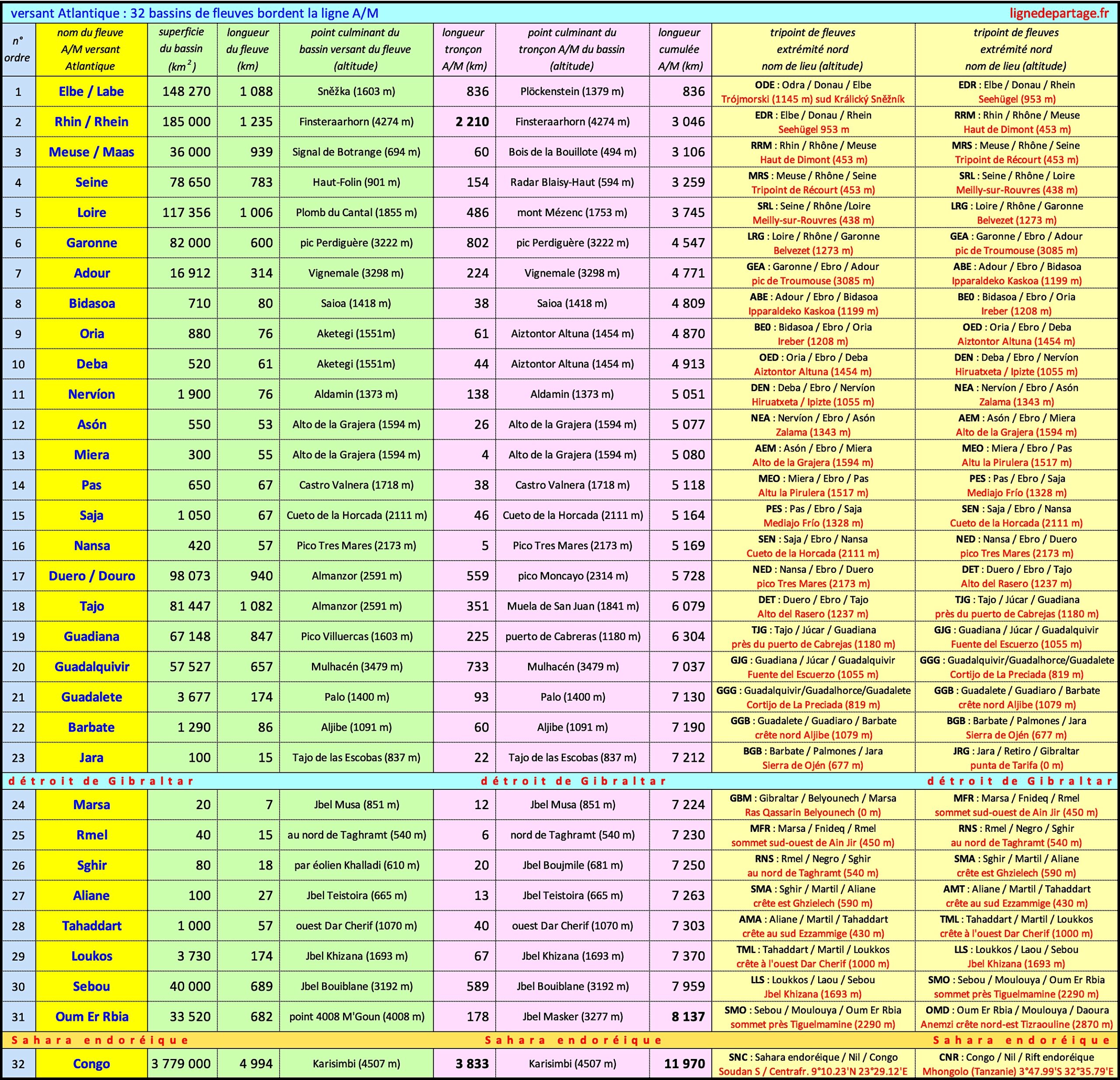 51 fleuves : la ligne A/M d’Europe est bordée par les bassins versants de 51 fleuves dont 34 sont dits côtiers (10.000 km2 – < 200 km). Parmi les 51 fleuves, 23 fleuves se trouvent sur le versant atlantique (> tableau) et 28 fleuves sur le versant méditerranéen (> tableau). Les 17 grands fleuves A/M (hors côtiers) sont : Elbe • Rhin • Meuse • Seine • Loire • Garonne • Adour • Duero • Tajo • Guadiana • Guadalquivir • Danube • Po • Rhône • Ebro • Júcar • Segura. Les 34 fleuves côtiers sont décrits dans ces articles : Hérault Orb Aude Têt • 9 ríos cantábricos • 17 ríos de Andalucía • 3 ríos 6 oueds atlantiques.