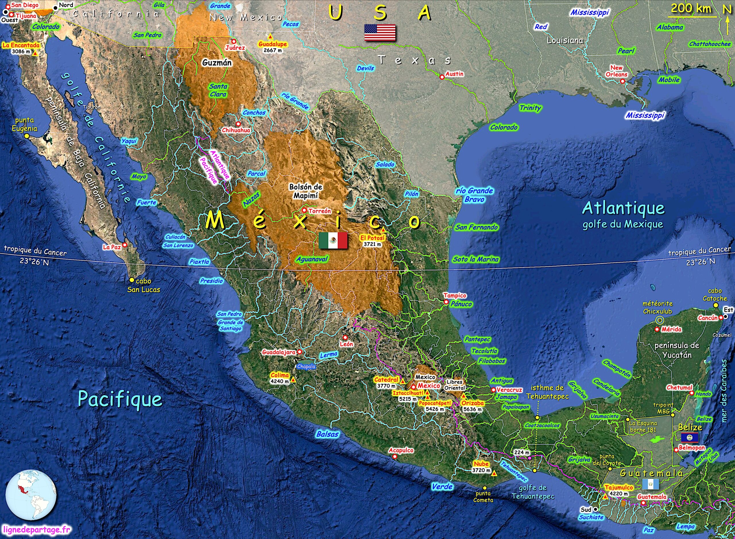 Le Mexique (México) est un des trois pays d’Amérique du nord avec le Canada et les Etats-Unis. Le Mexique se trouve réparti de part et d’autre du tropique du Cancer (≈ 23°26 N).