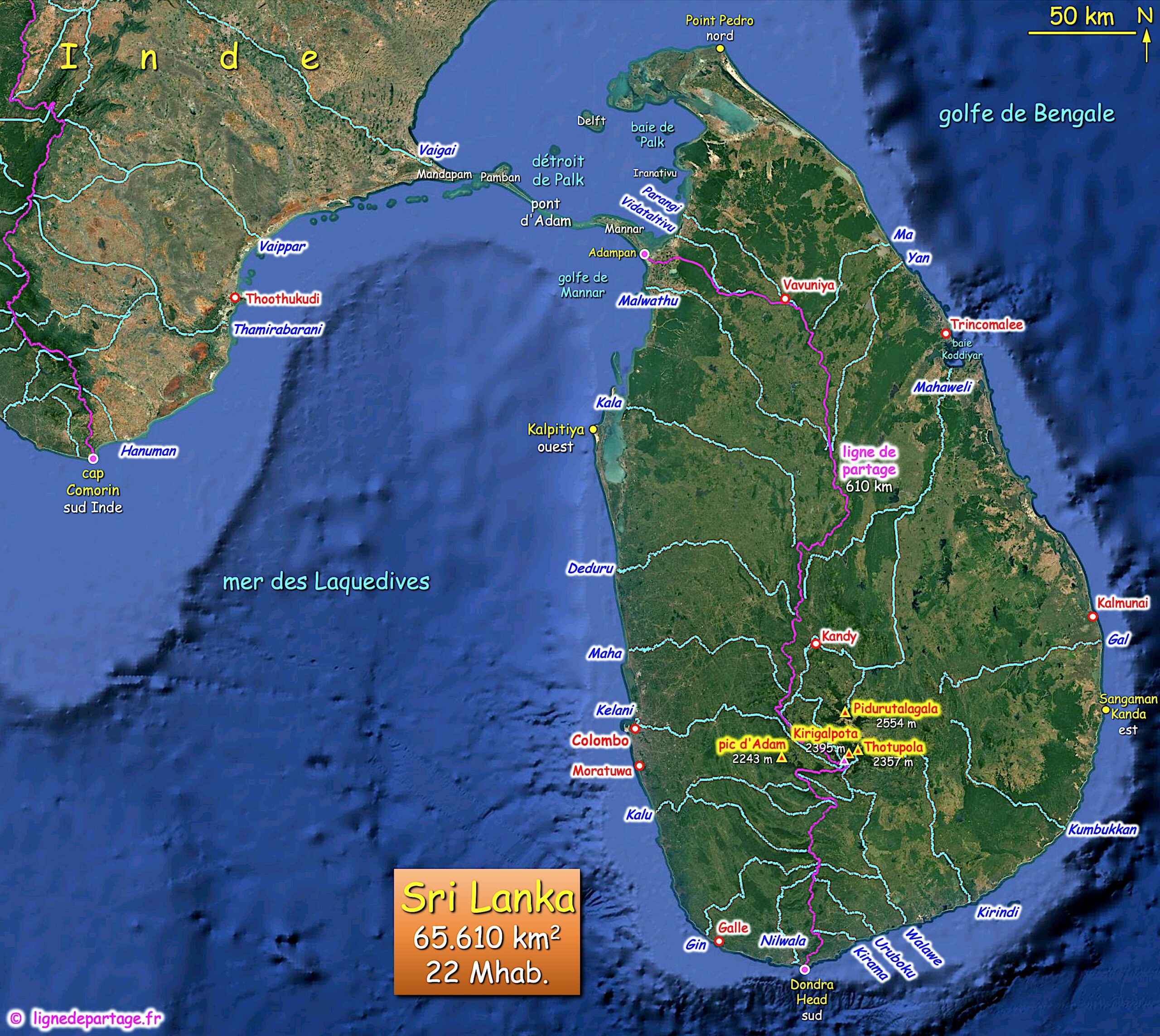 Partage Laquedives / Bengale : l’île de Sri Lanka s’écoule entre la mer des Laquedives à l’ouest et le golfe du Bengale au nord et à l’est. La ligne de partage des eaux Laquedives / Bengale a une longueur de 610 km entre Adampan, extrémité orientale de l’Isthme nommé Pont d’Adam (> carte > photo) et Dondra Head, extrémité sud de l’île (> carte > vidéo). L’altitude moyenne de ce partage est de 580 m et son point culminant se trouve à environ 2300 m sur un sommet sans nom du Massif Central situé à 750 m au sud du Kirigalpoththa 2395 m (> carte > photo), deuxième plus haut sommet de l’île.